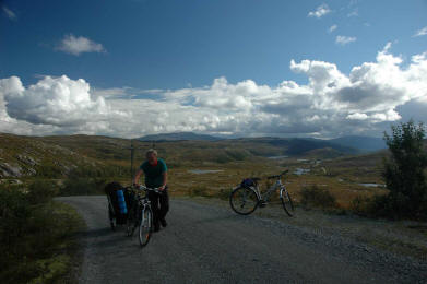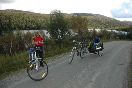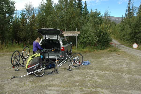 innfridde absolutt! Man er nesten helt avhengige av sykkelhenger for å få med seg tursekkene på en slik tur. Og sykkelhenger har vi tilfeldigvis akkurat kjøpt oss - som ungene bruker å sitte i. Nå ble sykkelhengeren lastet opp med to stk tursekker. Vi har levert ungene i Bindalen, og vært innom hytten en natt før vi parkerer bilen ved bommen på denne flotte veien. Underveis har vi fått lånt noe smørolje på bensinstasjonen for å smøre over kjedene på syklene før vi skal gi oss motbakkene i vold.