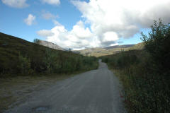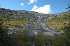 Terrenget ned i fra Gåaltoengaejsie er helt blankskurt, og det er ikke usannsynlig at dette er et rasutsatt fjell! Veien deler seg etter hvert der en vei går opp mot Kalvvatnan og damvokterboligen som kraftlaget har der oppe. Denne veien ser ut som den er dårligere vedlikeholdt og kanskje ikke så god å sykle. Vi sjekker ikke ut akkurat det denne dagen. Vi tar oss noe mat ved elva her og parkerer syklene midt i veien. Akkurat da kommer set en bil ned fra fjellet og jeg må spurte opp og flytte syklene. Litt uvanlig fjelltur dette ja :)