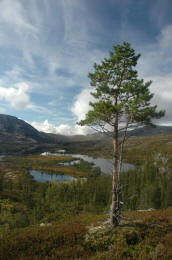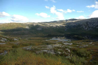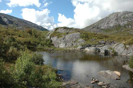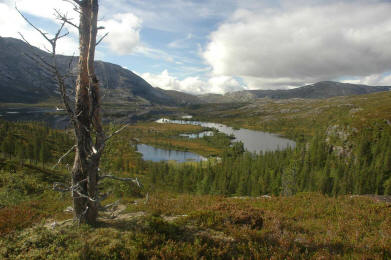 Vi legger nok en gang avgårde med friskt mot. Et par ganger må jeg gå av sykkelen og gå opp med min tunge henger på slep. Jeg spøler rett og slett med bakhjulet! Bak oss har vi et flott stykke Nord-Trøndelag - og etter hvert kommer vi inn i Nordland. Grensen mellom fylkene går ved vannskillet her. Det er godt å finne terrenget flatere her. Vi er på ca 600 meter over havet, og nå blir det lettere fjellterreng med litt småkupert - før de nydelige Nilsinetjørnene dukker opp. Det var her jeg og Sindre overnattet den gangen vi gikk i fra Kongsmoen til Mosjøen, og her finner jeg og Lill oss også en fin teltplass. Det er godt å slenge seg på den varme bergtrappen og bare late seg! Alt i alt syns vi det har vært en grei tur opp hit.
