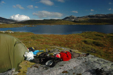 Det er godt å komme tilbake til leiren igjen. Vi ordner oss noe god middag. Før vi tar kveld ordner vi oss et skikkelig bål, av kvister og tørre furugreiner som vi har hektet på sekkene. Tidlig kveld denne dagen.