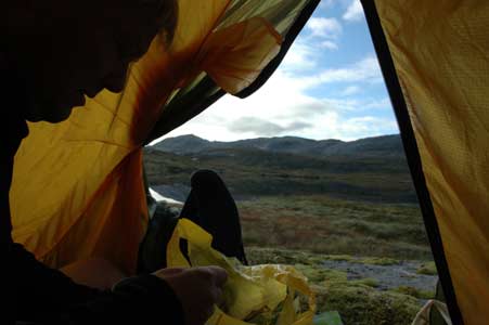 Nok en nydelig dag venter oss, og vannet ligger speilblankt utenfor teltet.