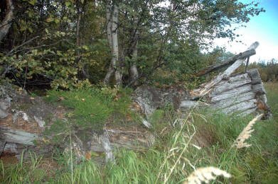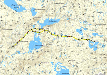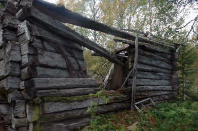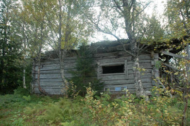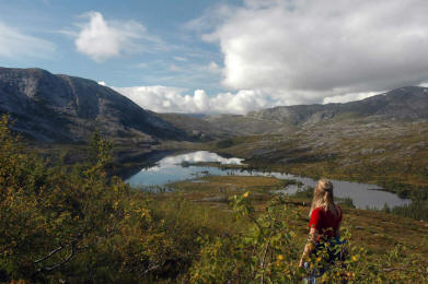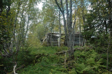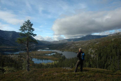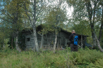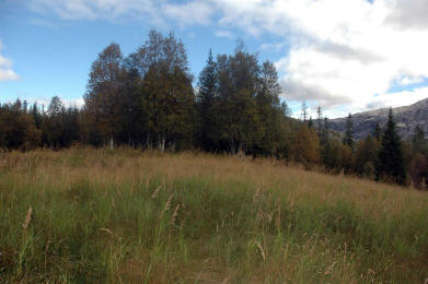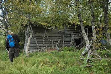 Vi er glade for å være her ved denne gården. Tilstanden på husene er mye bedre enn vi trodde, men om noen år er det nok borte mye av det. Vi har en lang marsj tilbake til vårt lille krypinn oppe ved Nilsinetjønnene, så vi drøyer det ikke alt for lenge før vi går samme ruten tilbake som vi kom. Når vi har kommet halvveis i gjennom Ringvassdalen foreslår jeg at vi går over høyden og ned. Her - østenden av Kalvkruvatnet. Etter at vi har krysset elva, går vi denne gangen langs med vannet før vi dreier stien opp og tilbake der vi kom i fra.