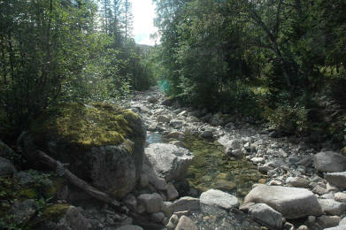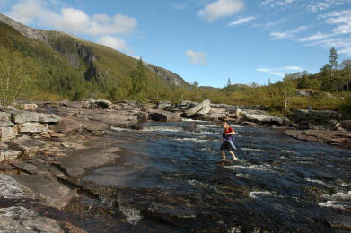 Vi nærmer oss Klarem, og her kommer en del store bekker ned i fra fjellet. Denne flotte sensommerdagen var den lett å krysse, men i flomperioder er det nok ikke helt enkelt å ferdes her inne i ødemarka.