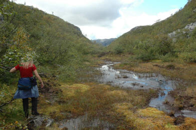 Klarem ligger litt bortgjemt til inn i mot fjellet - i Ringvassdalen. Vi har studert kartet og bestemt oss for å gå Ringvassdalen. Ruten betyr uansett at vi må krysse elva mellom Mellavatnet og Kalvkruvatnet. Lill leter etter vadeplass - elva er veldig liten. Det er bygd opp en terskel her. Dette er nok for å sikre jevnere tilførsel ned mot Kalvkruvatnet kan jeg tro