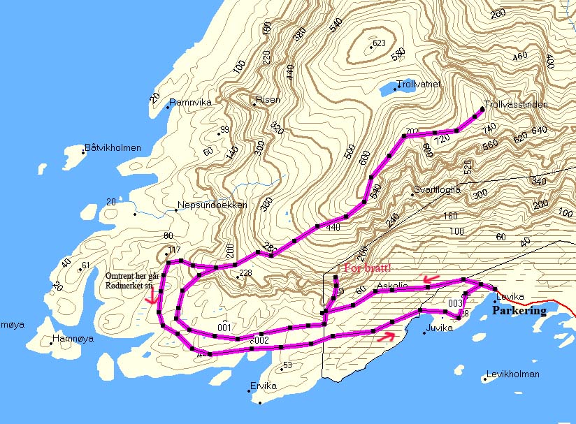 som det skulle være farbart rett opp lia og til ryggen til Trollvasstinden.