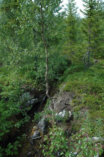 Terrenget åpner seg opp. Alle samiske navn i området viser at dette har vært - og fortsatt er - et kjerneområde for samene. Det er ikke så mange spor etter de gamle, men ett sted ser jeg noe som kan se ut som et gammelt samisk kåteplass.