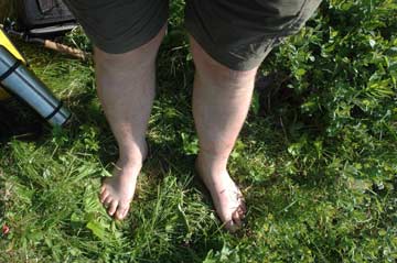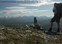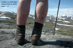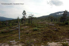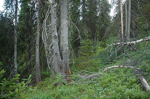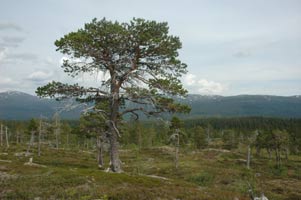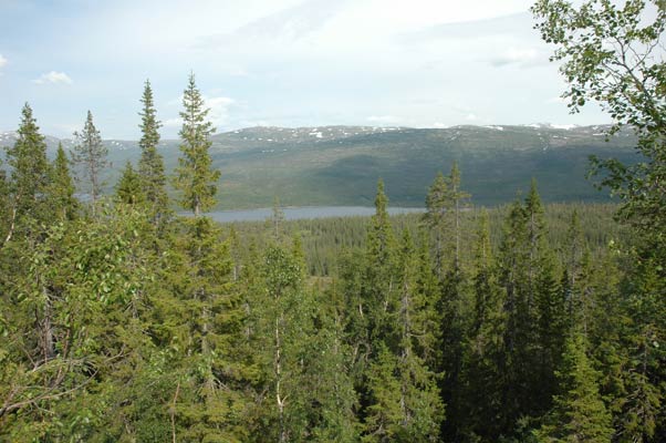 Dette landskapet med forvridde furutrær og uttørkede furustokker innimellom må være flott til skiturer for de som ikke liker oppoverbakker! Det blir etterhvert litt mer skog igjen, men jeg mener selv jeg holder et ganske ok tempo. Hadde det bare ikke vært så infernalsk mye klegg og blinding! Kleggen gir et lite forvarsel før den biter, siden den står og venter litt, mens blindingen, som er mindre og har grønne vinger eller noe slikt, biter med en gang den lander! Det føles i grunnen slik. Men jeg har valgt det selv. Heldigvis har jeg pakket med masse myggmiddel og mygghatt, som blir brukt mye på denne turen. Jeg skal prøve å ikke nevne de nevnte krekene noe mer på denne siden, men det fikk nok opmerksomhet under veis. Nei - gi meg heller høstens svale bris!
