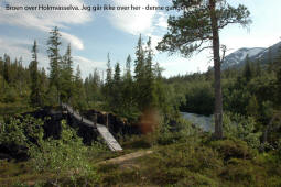 Som man kanskje har lagt merke til går det en skogsbilvei ned mot elva her, og her er det en stor og god bro over elva som kommer ned fra tjønnene man passerer ved Tosenfjellet. Jeg følger skogsbilveien så langt den går, før jeg følger en vag sti innover mot "Fjellryggen" som leder bort mot Holmvassdalen