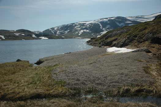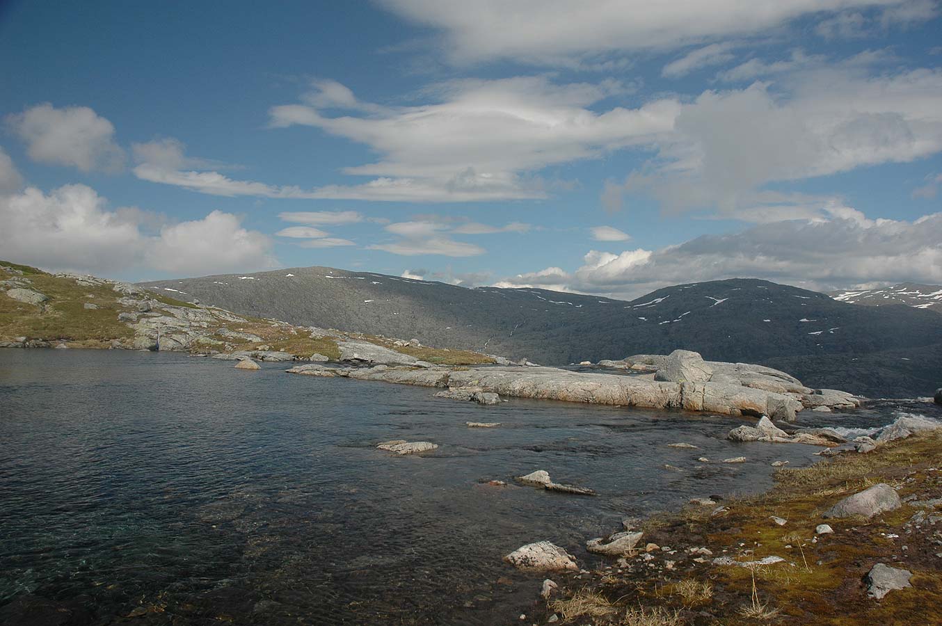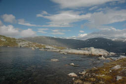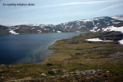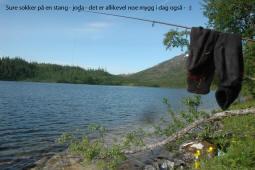 Ved bredden på andre siden står en stang og som har en ledning på seg. Det er vel en slags vannmengdemåling. Mens jeg sitter her ved dette vannet og venter på at maten skal bli klar kommer et lite helikopter durende over fjellet rett over hodet på meg. Det er på vei innover mot fjellene her, og det er vel i forbindelse med kraftanlegget at folk er her oppe. Eller reinsdrifta kanskje.