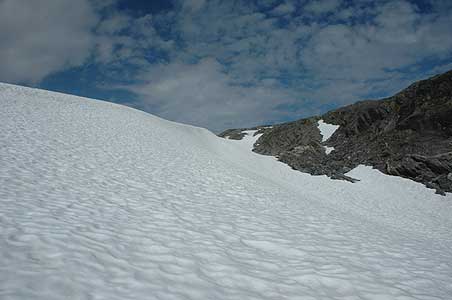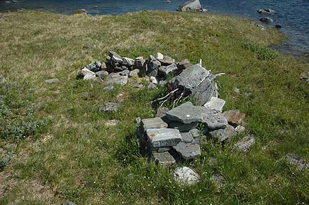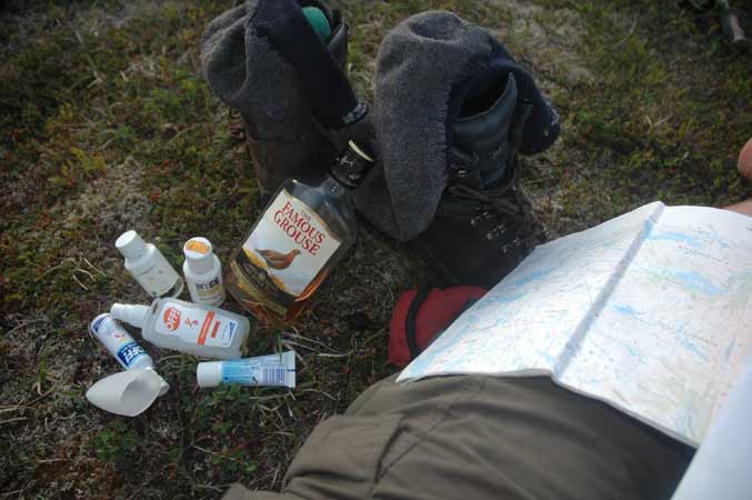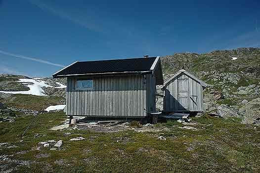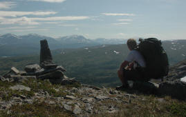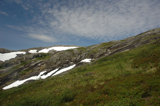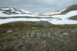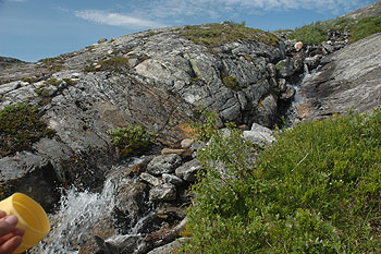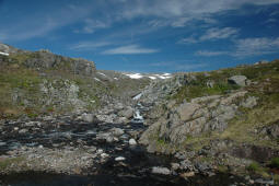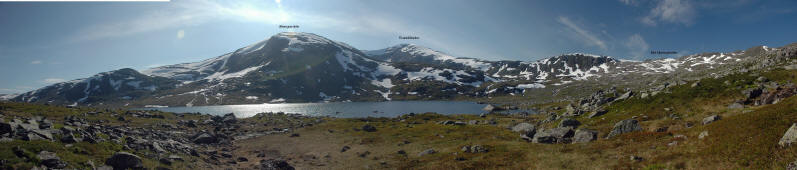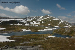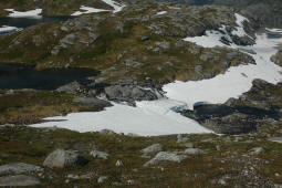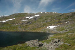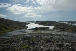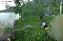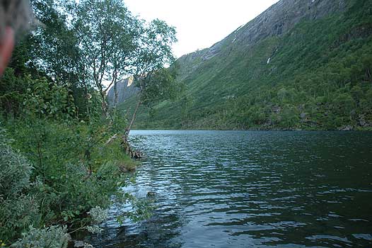 Jeg får akkurat kontakt med Lill denne kvelden og forteller om ymse planer jeg har. Blant annet lurer jeg på å gå ned mot E-6, eller videre sørover, uten å kommer til en konklusjon. Plutselig er jeg helt fri for batteri på telefonen! Og for en gangs skyld har jeg ikke med reservebatteri! Jeg innser at jeg må gå ned neste dag - rett og slett for å unngå at de hjemme skulle begynne å lure på hva jeg styrte med. Det blir siste gang jeg tar kontakt oppi fjellheimen og forandrer de planene jeg har! Fredag den 3 Juli 2009 Vel - på morningen har jeg ingen klar plan, men jeg fundere på å ta en tur opp til Jienniemessdurrienjavrie, som er et fjellvann opp i mot Kvannlitinden. Jeg og Sindre passerte dette på oversiden for ett år siden snart.