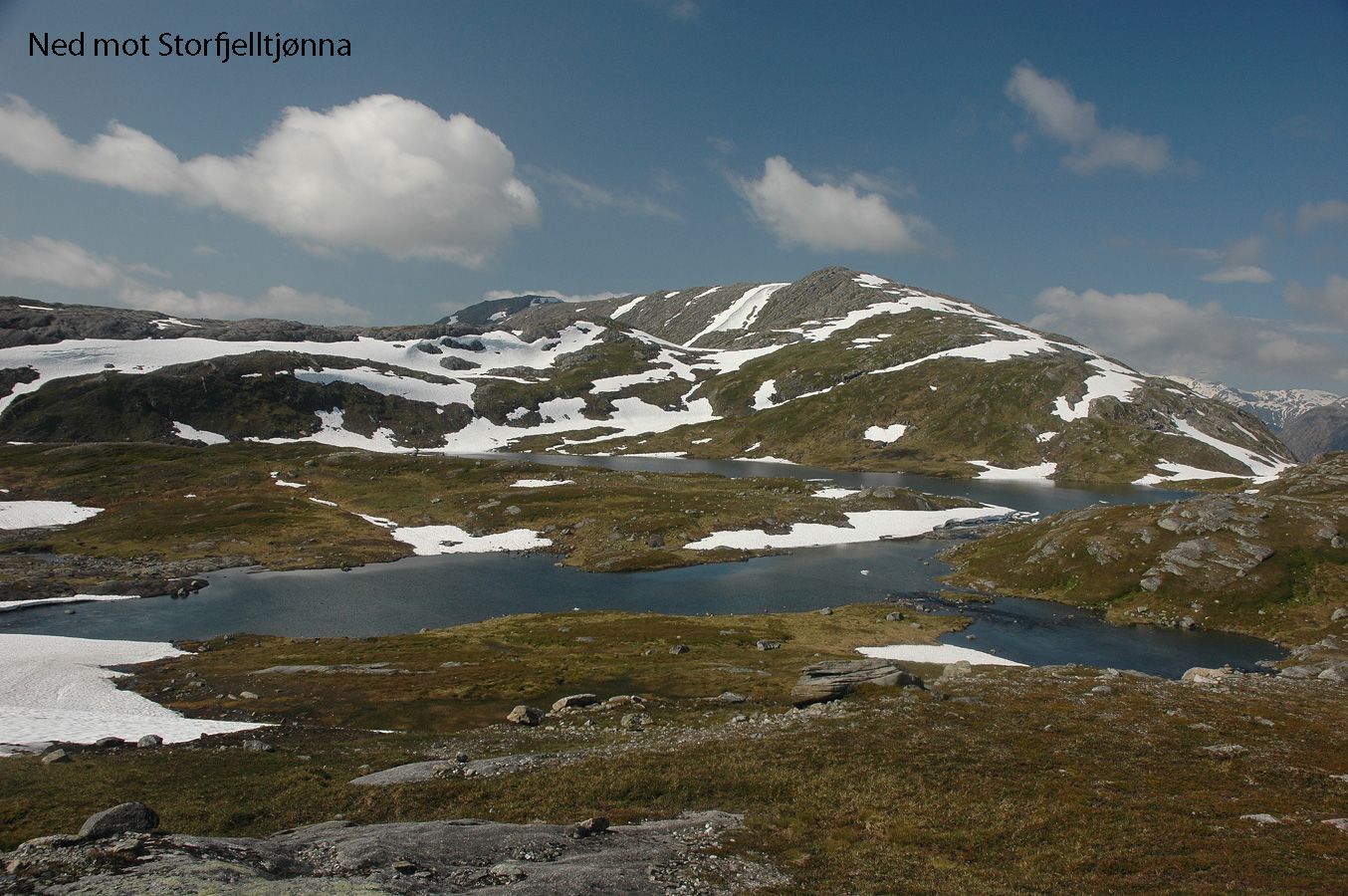 Sist jeg var her gikk jeg bortover her på ski. Det var full vinter og jeg hadde en ganske lang skitur bak meg da jeg gikk bortover her. Det var den gangen jeg hadde den uforglemmelige spaserturen i gjennom Tosentunellen! Det skal jeg ikke denne gangen! Storfjelltjønna - denne står i fare for å demmes opp