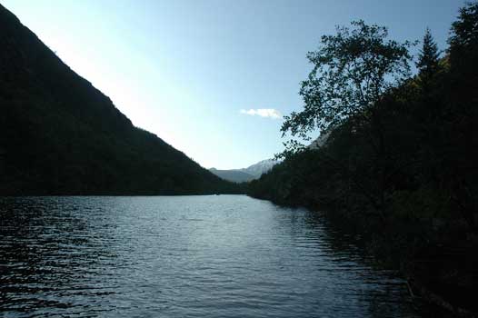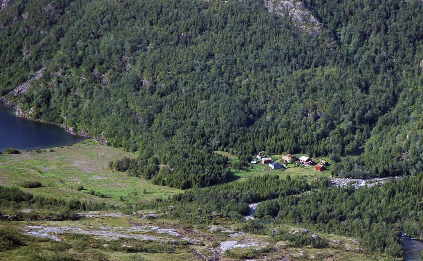 Jeg går fort forbi husene og er veldig spent når jeg nærmer meg vannet. Det er ikke tegn til sti langs med vannet her, men jeg ser i kartet og på GPS’en at det er markert en sti langs med her. Det er ikke annet å gjøre enn å sette i gang å traske. Litt opp i krattet blir jeg var at det er folk i nærheten!Makan til flaks – her kommer eierne akkurat når jeg kunne trenge skyss. Jeg karrer meg ned igjen og kommer i prat. De er en hel familie på tur inn hit til denne idylliske plassen. Vi prater om løst og fast på båtturen over vannet og han forteller om eventyrlige fisketurer opp til Namnlausa i ”Gamle dager”. Det kunne være varierende med fisk før, slik det er i dag NB: Om man skal ferdes langs med dette vannet må man på en plass holde seg helt nede i vannskorpa. Om det er mye vann kan man risikere å måtte vade her, men det er ikke farbart oppover her. Det er bygd en flott ATV vei her og når jeg begynner å