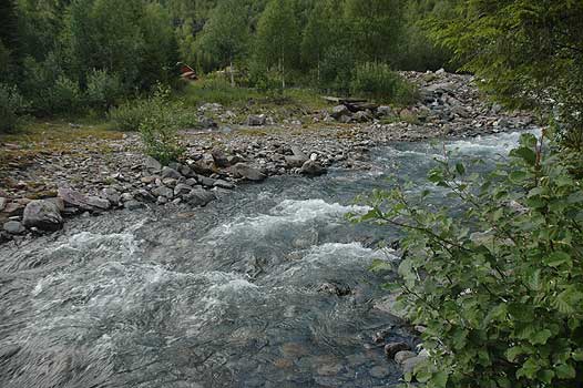 Jeg finner ingen god sti i fra dette området oppe ved fossene og ned mot husene. Det er en del kratt, og et par store bekker som må krysses. Jeg orker ikke å ta av skoene og går bare fort over og unngår allikevel å bli skikkelig blaut. Men ved husene kommer jeg til en elv som er ganske stri. Jeg ser at de har gjort klart stokker for å bygge bro over her, og det kan sikkert trengs. Her blir jeg skikkelig våt på bena!