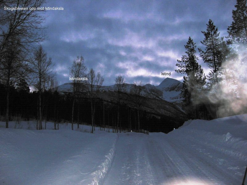 Juledagene ble tilbragt i Bardu og juleaften var det plan om å gå opp på Istind aksla. Dagen før hadde vi vært oppe på hytten til Anne og Rolf, på 480 meters høyde, og forholdene videre oppover så fine ut. Været var fint, litt vind og minus 10 °. Rolf og Øystein gikk på ski, mens jeg fikk låne et par truger, som gjorde nytten i den dypeste sneen. På starten av turen kom det 7 helikoptre fra 330 skvadronen, som kjørte i stjerneformasjon både opp og ned Bardu dalen. Dette er en tradisjon hvert år. Selve Istinden var jeg på sommeren 2002, og det var en flott tur sammen med Anne, Rolf og Espen. Første stopp på turen var i hytten, der vi fyrte opp i ovnen og tok oss en brødskive, før vi gikk videre opp, denne gangen med truger og på ski. Fint og lettgått oppover, samt en del skare, gjorde at vi kom opp før det ble mørkt igjen. Tiden med lys er begrenset, men måneskinn og hodelykt hjelper på. Rolf og Øystein rente ned på ski, mens jeg gikk ned. Nede ventet en bedre julemiddag med tilbehør !