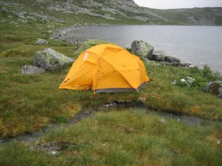 Det er en egen ro over dette området. Her kunne vi sikkert klart oss lenge, og også vært lenge. Drømmen er vel kanskje å kunne vandre mer her, med storsekken på ryggen. Kanskje over mot Elgviddevannet igjen, og Mosskardvatnan. Men det kommer vel en dag snart, som det kunne passe med noe slikt. Vi finner roen her, men på nattmorgenen begynner det å regner noe helt utrolig. Det øser ned noe aldeles forferdelig. Teltene holder heldigvis tett, men det drypper inn i gjennom en åpen ventil i taket, og det blir også en liten dam av kondens i et hjørne. |