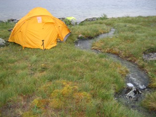 vises. Etter noe leting fant vi en plass som hadde alt dette, unntatt skygge på morningen. Denne natten viste BP seg som en habil snorker. Jeg og Petter måtte til slutt evakuere teltet, men det var kanskje like mye på grunn av at det ble varmt i teltet på grunn av en stekende sol.