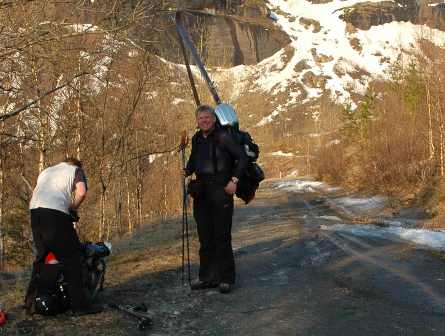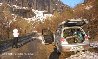 Ved ankomst Leirskarddalen er vi spente på hvor mye snø som ligger igjen etter den siste tidens varme. På Tosenfjellet var det fortsatt snø og skiføre fra parkeringen så vi regnet med at det skulle være skiføre langt ned i dalen men den gang ei. Sindre ved bilen før oppstart. Dårlig skiføre, men jeg tør ikke bryte bilen over den harde dype snøen så vi stopper her.