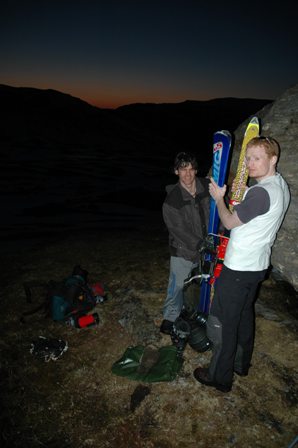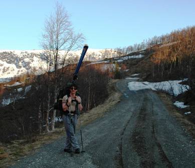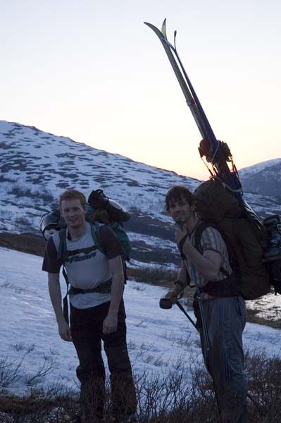 Sindre får etterhvert problemer med å bære skiene på den lille sekken sin, og Leo tar dem derfor på ryggen opp i gjennom lia. Dette er ikke første gangen han viser sin styrke som Sherpa på denne turen :).