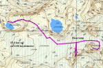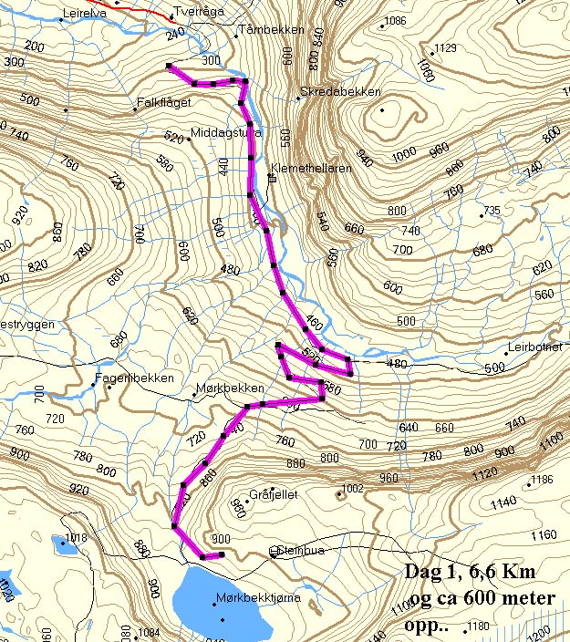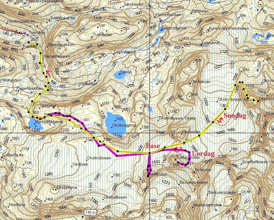 Oppstart fra Leirskarddalen og opp til ca 900 meter | Fra 900 meter til Basecamp og fra Basecamp opp på Tvillingtindan og Vestinden | Fra Basecamp til Oksskolten tilbake til Base og ned til bilen |
