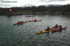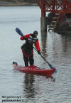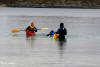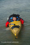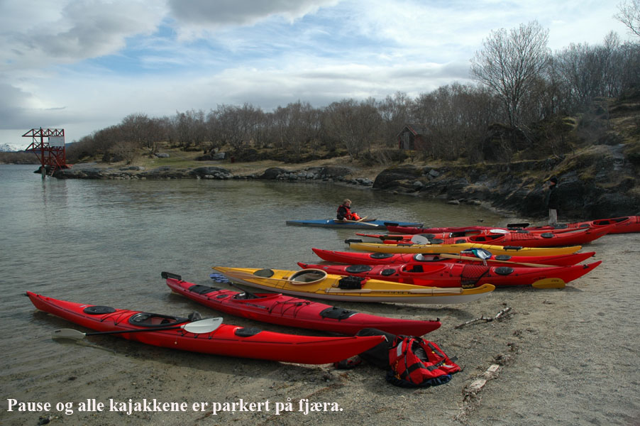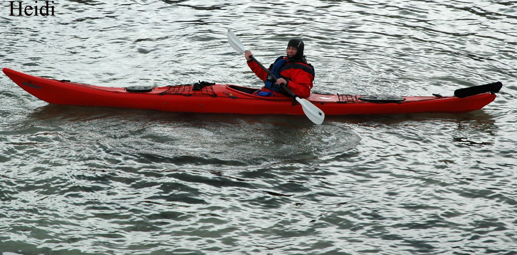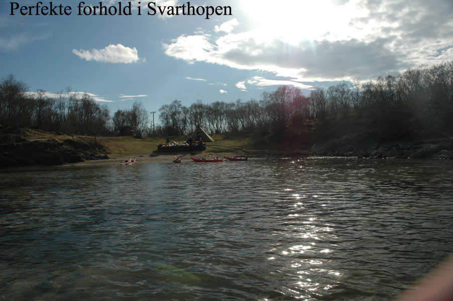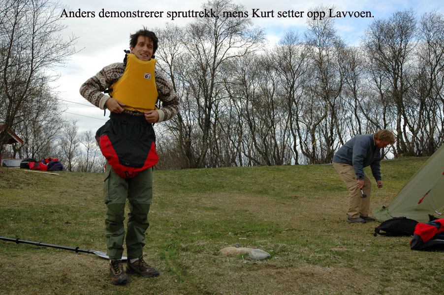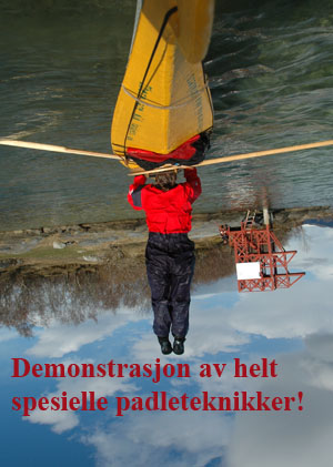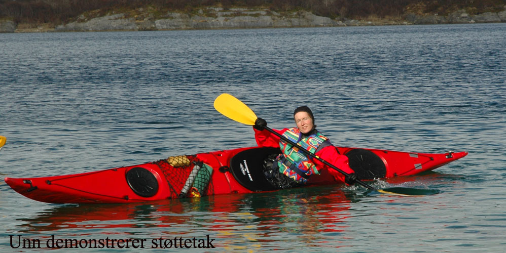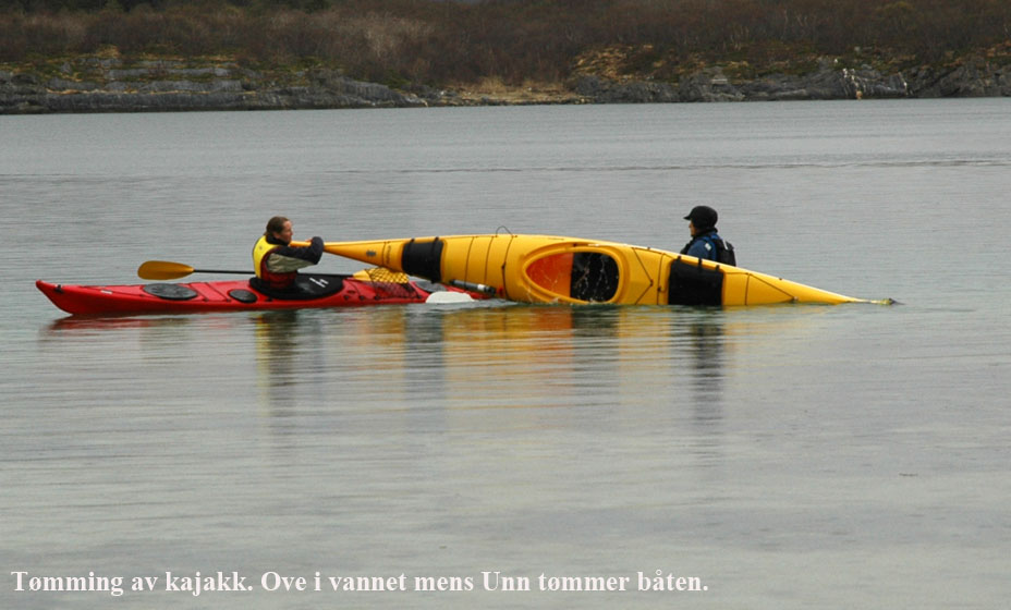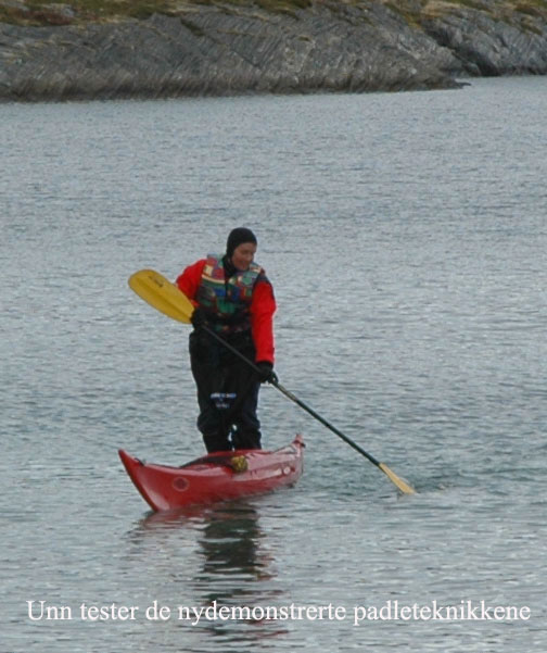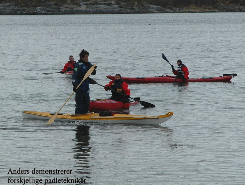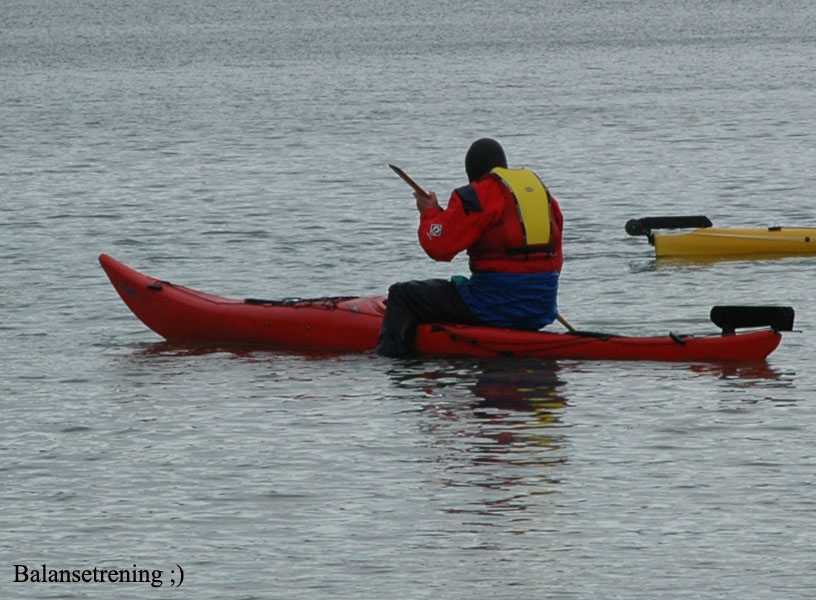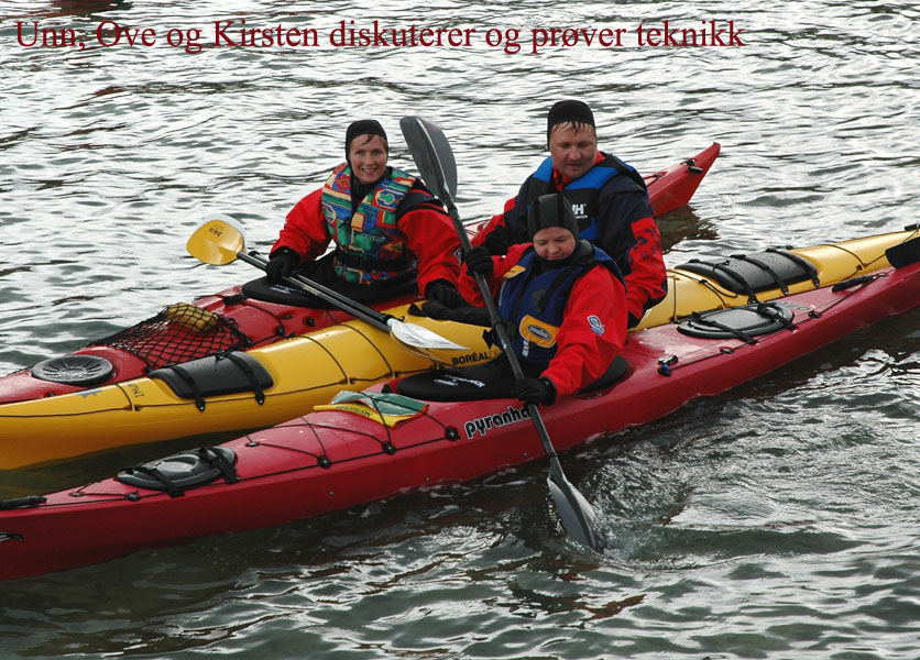 var det kanskje ikke, men med tørrdrakt gikk det bra. Kurt hadde satt opp en Lavvo med en gassfyr inni, som vi kunne bruke til å varme oss i pausene. Først var det utdeling av drakter og utstyr. Deretter ble vi delt inn i grupper av 2 og 2. Kameratsjekk av utstyr er en viktig del av padling. Altså sjekk av sprut-trekket; at hempa synes, og at vesten er satt skikkelig på. Første øvelse var å gå rundt å komme seg ut av kajakken selv. Det er en terskel å gå over, å legge seg over helt til man går rundt i det kalde vannet. Heldigvis var draktene tette, men man kunne kjenne at det var kaldt badevann ved at man ble litt kalde i pannen. Etter at alle hadde badet, lærte vi 8 tallstak, altså sideveis forflytning, og teknikk for å snu kajakken fort rundt 360°, samt støttetak. Deretter trente vi på kameratredning og selvredning med oppblåsbar årepose. Alt dette selvsagt avbrutt av nødvendige pauser med varm drikke og mat i Lavvoen. Anders demonstrerte noen flotte teknikker med å stå i kajakken å padle. Verken Unn eller Siri skulle være noe dårligere og mestret denne teknikken til fulle! Deretter viste Anders oss noen akrobatiske øvelser på kajakken, som virkelig var spektakulære. Unn var ikke noe dårligere, og mestret også denne øvelsen til fulle! Se forøvrig disse bildene !