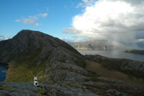 Vi holder god fart ned i fra toppen. Varden står merkelig nok ikke på det høyeste punktet på Åkvikfjellet, men vi gidder ikke gå bort dit nå.