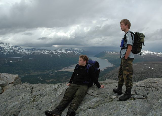 Guttene med Gråsjøen i bakgrunnen. Vi skal helt ned hit.