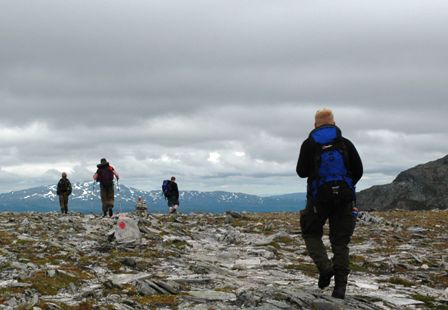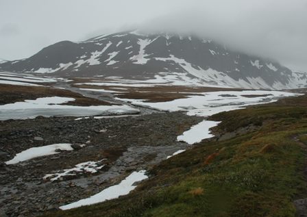 Og så pakkes kameraet ned. Nå er det dags for å lange ut. Skodden henger ned i fjellet og sikten er ikke så lang. I tillegg øser regnet ned. Jeg selv går i kun nettingskjorte hele veien opp til vi er på toppen, og tar på jakke der, og det samme gjør de andre. Det er i grunnen en utfordring å kle seg når det øser ned samtidig som man kommer opp i en kald fjellverden. Inn i mellom forsvinner rødmerkene, og et par ganger må jeg slå på GPS for å sjekke om vi er på stien eller ikke. Snøen dekker altså rødmerkene såpass langt fram at de er vanskelige å finne. Vi stopper å spiser på fjellet her. Det er en lang marsj, men ikke særlig koselig å stoppe lenge i det været som er, men vi finner nå en lun plass på det høyeste punktet og stopper her. Ved Kamtjønnin - Under ryggen til Blåhø til venstre