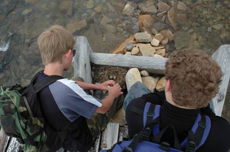 Vi kommer etter hvert til elva Minilla, og på et brokar her ligger det jammen et måkereir.
