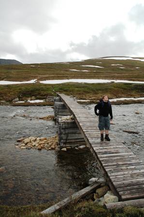 Vi har oss en god siste pause her ved broa. Det er fortsatt ganske så langt igjen. Menyen på Jøldalshytta er fisk denne dagen, og guttene stemmer for at vi skal gå til bilen og kjøre til Oppdal og spise der i stedet.