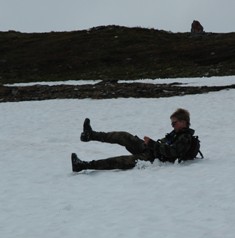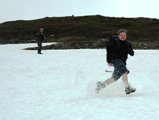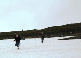 Vi kommer etter hvert til noen store snøfelt og guttene hopper og spretter ned her. Jeg for min del furer ned.