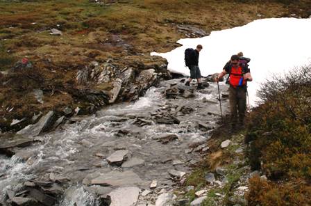 Vi har snakket med andre folk som har gått samme trase og de fortalte at Gravbekken ville være en utfordring. Vi traff noen folk oppi lia der som skulle samme vei. De var å så på blomster i området der. Vi fant til slutt en bro over denne bekken. Kryssing hadde uansett ikke vært noe stort problem her, men vi hadde fått oss en god kald vading.