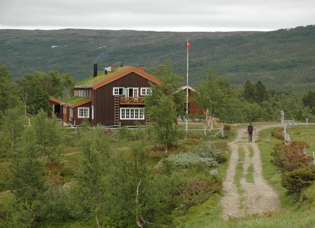 Stien ned er lang og ikke noe særlig god å gå på. Men vi ser hytten i det fjerne nede i dalen og ikke lenge etter er vi nede ved denne flotte hytten